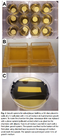使用人唾液和牙菌斑接種,在羥基磷灰石(HA)和光極表面培養(yǎng)7天生物膜(圖2)。