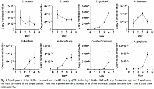 早期(第1天):Veillonella spp.和 S. oralis主導(dǎo);后期(第4天):厭氧菌增加4 log。
