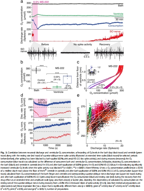 麻醉劑MS-222阻斷神經放電后,O?消耗降低~50%(圖3),證實神經元活動是主要耗氧源;