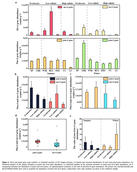 ? 細(xì)菌pmoA基因和古菌mcrA基因拷貝數(shù)(圖2a),顯示細(xì)菌豐度普遍高于古菌(圖2d),且無顯著季節(jié)差異(圖2c)。