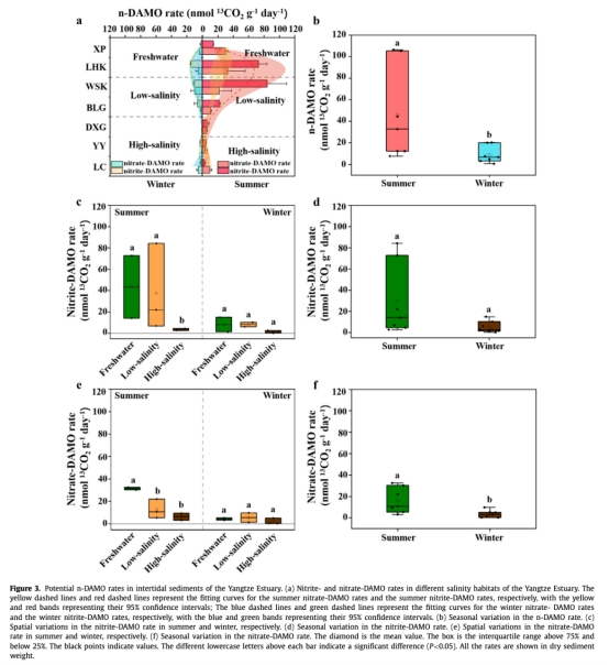 ? 硝態(tài)氮依賴型(古菌)和亞硝態(tài)氮依賴型(細(xì)菌)甲烷氧化速率(圖3a),顯示夏季活性更高(圖3b),且淡水/低鹽區(qū)活性顯著高于高鹽區(qū)(圖3c, e)。