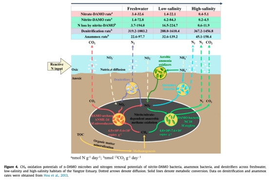 4. 耦合機(jī)制:沉積物-水界面的氧梯度促進(jìn)氨氧化菌與n-DAMO細(xì)菌的互作,支持亞硝態(tài)氮供應(yīng)(圖4)。