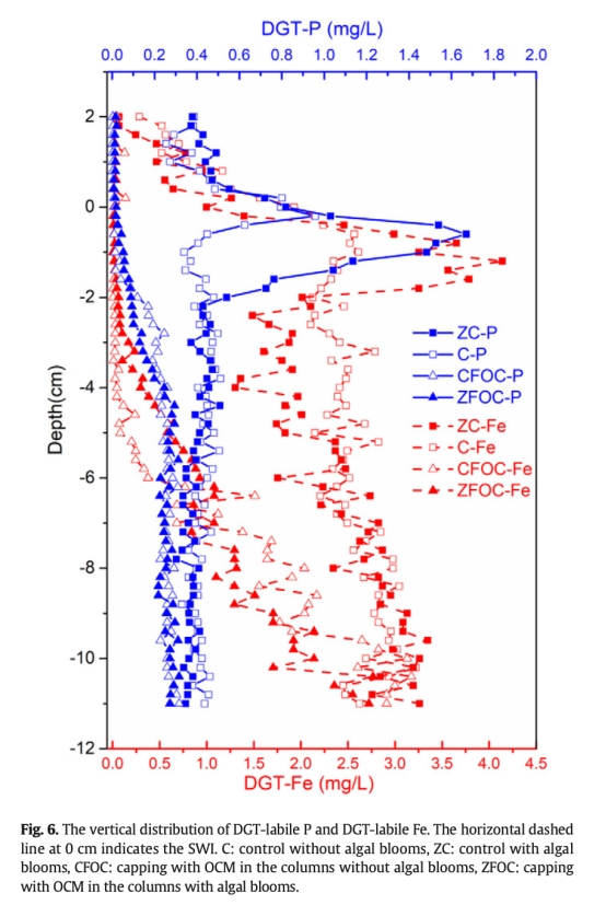 ? OCM消除藻系統沉積物表層(-1至-3 cm)的活性磷/鐵峰值,抑制內源釋放