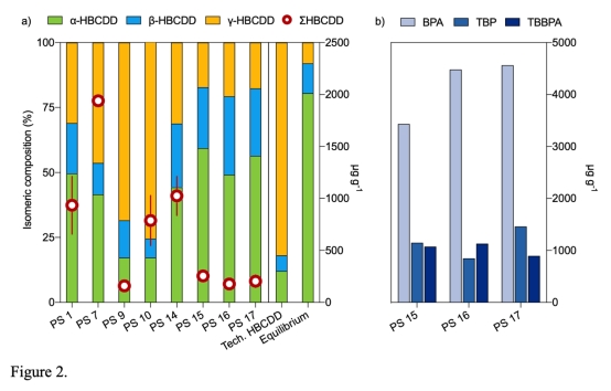 ? 8/16份PS含HBCDD(100-1,940 μg/g),α/β/γ異構體比例各異