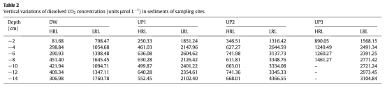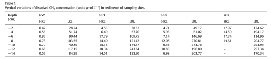 ? 碳氣體濃度:沉積物孔隙水CH?和CO?(表1-2)、上覆水CH?(圖3)。