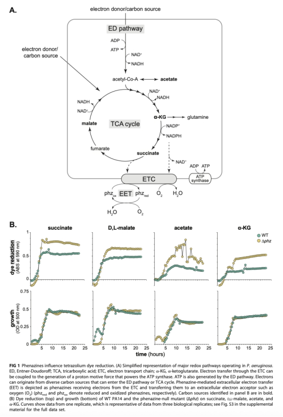 通過比較野生型PA14和吩嗪缺失突變體在不同碳源條件下的呼吸活性、末端氧化酶基因表達(dá)、吩嗪產(chǎn)量和種類,以及生物膜內(nèi)的氧化還原電位,分析吩嗪生產(chǎn)與呼吸代謝的相互影響。