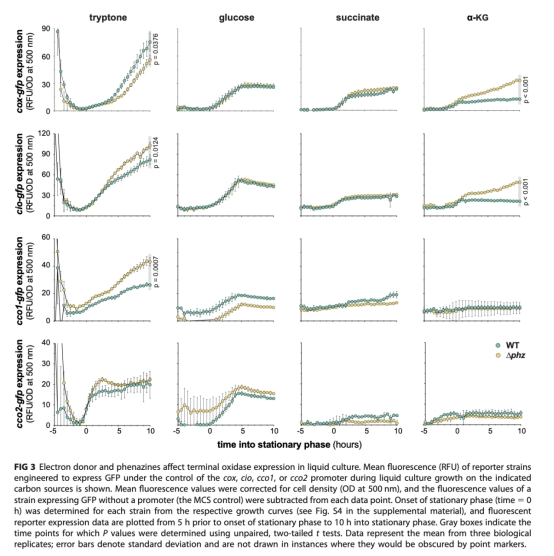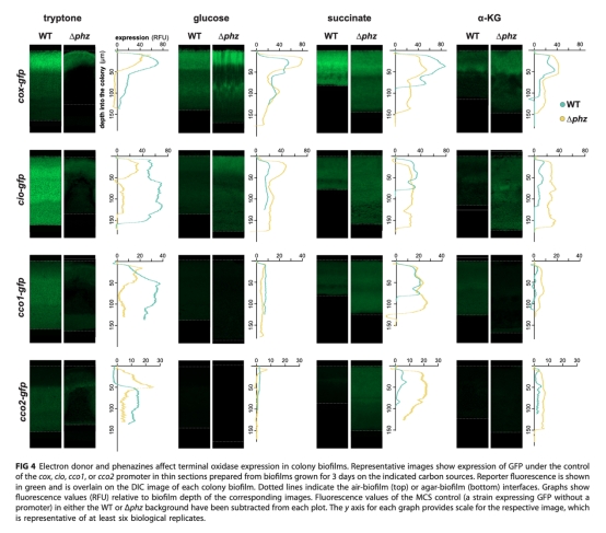 2 使用GFP報告菌株測量末端氧化酶基因表達(dá),說明吩嗪如何影響電子傳遞鏈組成(圖3, 4)。