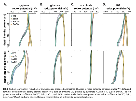 4 使用微電極測量生物膜內(nèi)的氧化還原電位,展示吩嗪在生物膜中的實(shí)際利用情況(圖6)。