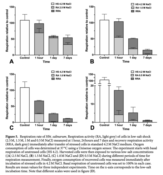 使用丹麥Unisense微氧電極測量的呼吸活性數據(圖5)直接反映了細胞能量代謝狀態。數據顯示,低鹽條件下呼吸速率顯著下降(尤其是低于1.5 M NaCl及長時間暴露),但一旦轉移回高鹽條件,呼吸活性立即恢復(甚至 after 7 days at 0.5 M NaCl)。這表明即使經歷極端低鹽壓力,部分細胞仍保留完整的呼吸鏈和離子泵功能,能夠快速重啟能量生產,為蛋白質修復、分子伴侶作用和離子穩態恢復提供能量基礎。這些數據證實了細胞在低鹽應激下仍維持基本代謝能力,并突顯其恢復的迅速性和高效性,對理解嗜鹽古菌在鹽度波動環境中的生存策略至關重要。