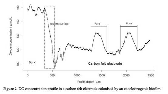 5 材料結構影響:剖面顯示碳氈內部孔道(800-2500μm)中氧濃度回升(~130μM),表明多孔結構促進氧氣通道化,影響生物膜的空間分布和功能。