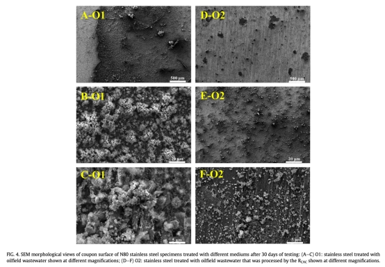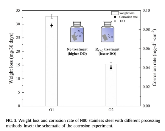 2. 腐蝕速率:來(lái)自Fig. 3,N80不銹鋼在處理后廢水中腐蝕速率降低超過(guò)兩倍(從0.084 mg·d?1·cm?2降至0.039 mg·d?1·cm?2),意義在于驗(yàn)證DO去除對(duì)腐蝕的抑制作用。