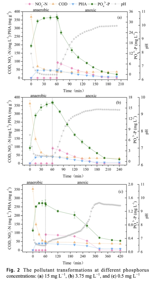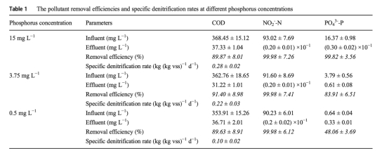 1. 污染物濃度變化(來自圖2和表1):監(jiān)測了COD、NO??-N和PO?3?-P的濃度沿時間的變化。該數(shù)據(jù)直接反映了不同磷濃度下系統(tǒng)的脫氮除磷性能,表明高磷濃度有利于磷的去除,而對COD和NO??-N的去除效率影響不大,但影響了反硝化速率。