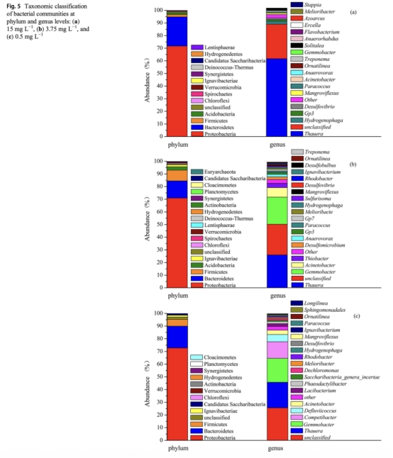 4. 微生物群落結(jié)構(gòu)(來自圖5):通過高通量測序獲得了不同磷濃度下污泥樣品在門和屬水平的微生物群落組成。該數(shù)據(jù)從微生物生態(tài)學(xué)角度揭示了現(xiàn)象背后的本質(zhì)原因,即低磷濃度下DPAOs(如Thauera)豐度降低而GAOs(如Competibacter, Defluviicoccus)豐度上升,直接關(guān)聯(lián)了微生物種群變化與系統(tǒng)性能(除磷效率低、氣體產(chǎn)量高)的變化。