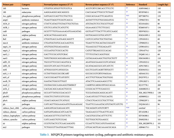 ? 微生物豐度與活性:使用流式細(xì)胞術(shù)(Flow Cytometry)定量總細(xì)菌細(xì)胞和含葉綠素a的藻類細(xì)胞的數(shù)量和大小;使用微流體定量PCR(MFQPCR)定量與營(yíng)養(yǎng)循環(huán)(C, N, P, S)、抗生素抗性和病原體相關(guān)的功能基因的絕對(duì)豐度(見表3)。