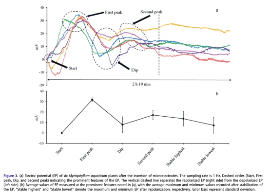 1. 將微電極插入狐尾藻莖部中柱的行為本身會觸發一個可傳播的電信號,該信號被鑒定為系統電位(SP)。其特征是傳播速度緩慢、具有特定的時間動態(雙峰形)以及需要長時間(50-70分鐘)才能重新達到穩定狀態。