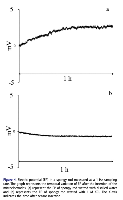 4. 對照實驗的電位記錄(來自圖4):記錄了電極插入濕潤海綿棒(蒸餾水或1 M KCl)后的電位變化,其電位值很?。?.5-2.9 mV)且保持線性穩定,無顯著波動。該數據至關重要,它排除了測量系統、電極本身或非生物離子導電材料產生所觀察到的復雜電位信號的可能性,強有力地證實了雙峰電位信號是活體植物組織特有的生物電響應。