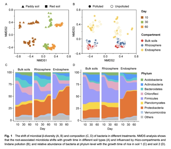 1. 水稻根際微生物組裝受生長時間、土壤類型和根區(qū) compartment 的顯著調(diào)控,而林丹污染主要通過刺激根內(nèi)微生物組構(gòu)建產(chǎn)生影響