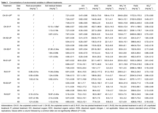 2. 水稻生長通過根系氧損失(ROL)改變根際氧化還原環(huán)境,與微生物介導(dǎo)的競爭性電子消耗過程(SO?2?還原、Fe(III)還原)耦合,抑制林丹的還原性脫氯降解(60天時降解率降低0.5-1.2%)