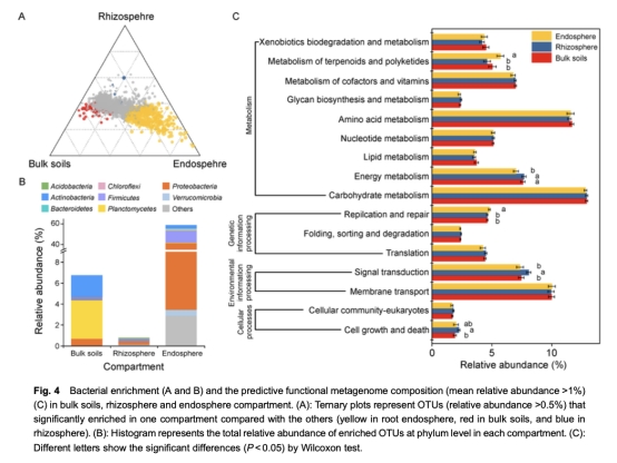 ? 測量數(shù)據(jù):根內(nèi) compartment 顯著富集Proteobacteria和Firmicutes(占總豐度58.9%),預(yù)測功能顯示根際富集能量代謝KO條目