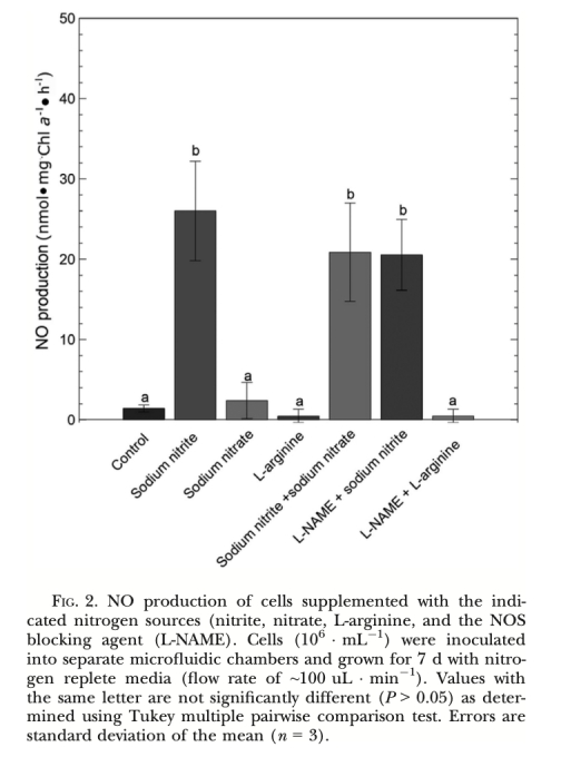 1. 產生機制: 柱狀脆桿藻的NO產生主要依賴亞硝酸鹽(NO??)途徑,由硝酸還原酶(NR) 催化。未檢測到L-精氨酸-NOS途徑的證據。光照通過維持活躍的光合電子流(促進亞硝酸鹽同化)抑制NO產生。光合電子傳遞受阻(如黑暗、DCMU處理、高光脅迫)導致亞硝酸鹽積累并觸發NR介導的NO產生。