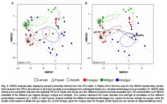 將微生物生態分布與具體的環境驅動因子直接鏈接:本研究沒有停留在觀察到“菌群不同”的現象上,而是通過Unisense電極測得了“為何不同”的原因。通過圖2B 的NMDS擬合分析,研究將菌群結構數據與物理化學數據進行了統計關聯。結果顯示,幼蟲腸道的高pH值是其菌群結構的主要塑造者,而成蟲腸道菌群則主要受氧氣水平和氧化還原電位的控制。這種定量化的關聯性分析極大地增強了結論的說服力,從“相關”推進到了“機理”闡釋的層面。