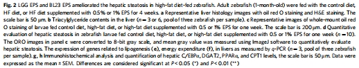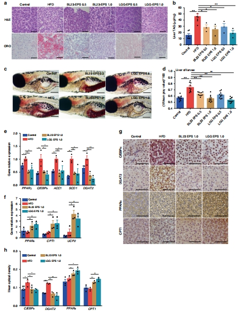 表型確認(rèn):首先在高脂飲食喂養(yǎng)的斑馬魚(成年和幼魚)模型中,確認(rèn)LGG EPS和BL23 EPS在減輕肝臟脂肪變性和誘導(dǎo)肝臟損傷上的不同表型。