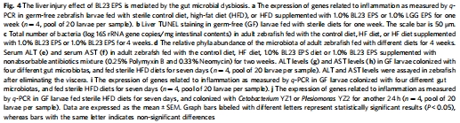 微生物組作用:通過無菌斑馬魚實驗、抗生素清除菌群實驗和菌群移植實驗,證明BL23 EPS的肝損傷效應(yīng)依賴于其誘導(dǎo)的腸道菌群失調(diào),而非多糖本身直接毒性。