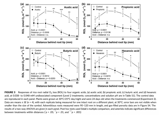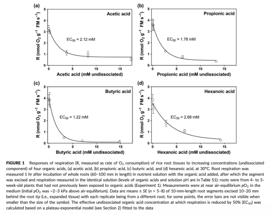 摘要指出,水淹土壤中含有厭氧微生物產生的單羧酸(有機酸),這些酸可積累到植物毒性水平,并促進濕地物種根系徑向氧損失(ROL)屏障的發展。本研究測試了低濃度有機酸(乙酸、丙酸、丁酸、己酸)可能誘導水稻根系ROL屏障形成的假設。結果發現,每種有機酸單獨均能觸發ROL屏障,但對根系伸長影響很小或沒有影響。一些與木栓質生物合成相關的基因轉錄本增加。根系呼吸沒有或僅中度抑制,但超過一定濃度后呼吸呈指數下降。EC50(抑制50%呼吸的有效濃度)順序為丁酸、丙酸、乙酸、己酸。研究揭示了有機酸作為環境信號觸發根系適應性反應的機制,有助于理解植物淹水耐受的分子調控。