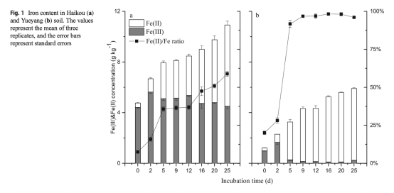 1. Fe(II)和Fe(III)含量變化:來自Fig. 1,數據顯示岳陽土壤鐵還原更徹底,Fe(II)比例高,研究意義在于表明鐵還原程度與土壤類型相關,影響有機碳分解速率。