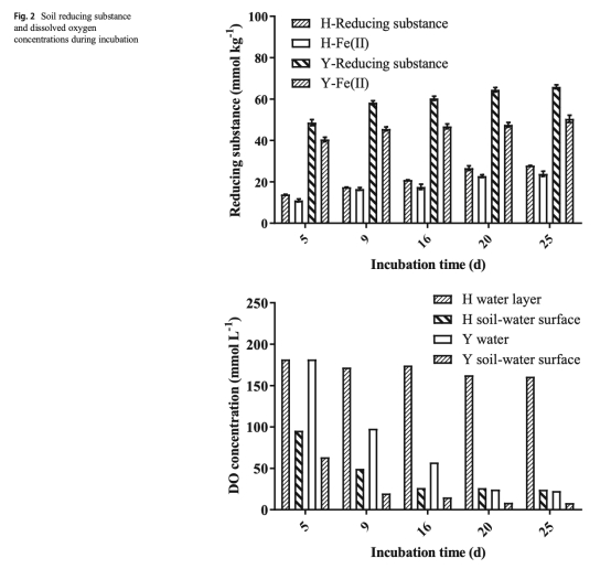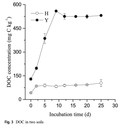 3. DOC濃度變化:來自Fig. 3,數據顯示岳陽土壤DOC增加更顯著,研究意義在于DOC增加表明有機碳溶解,與鐵還原過程耦合,促進碳分解。