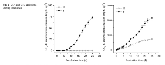 5. CH4和CO2排放:來自Fig. 5,數據顯示岳陽土壤氣體排放更高,研究意義在于直接量化有機碳分解為溫室氣體,鐵還原刺激分解過程。