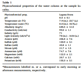 數據:pH (8.0), 溫度, 鹽度 (71 g/L), 砷濃度 (206.8 μM), 硫化物濃度 (103.9 μM), 主要離子(SO?2?, K?, Mg2?等)。