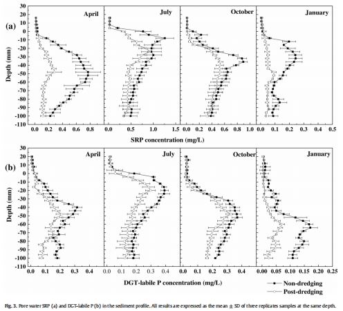研究意義:這是論文的核心證據(jù)。數(shù)據(jù)顯示,疏浚顯著降低了孔隙水SRP和DGT有效態(tài)P的平均濃度和峰值。效果在空間上具有異質(zhì)性(不同深度效果不同),在時(shí)間上具有季節(jié)性(冬春季效果更佳)。這直接證明了疏浚對(duì)抑制內(nèi)源磷釋放的有效性,并揭示了其效果的復(fù)雜性。
