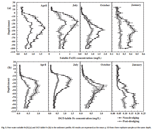 這些鐵氧化物作為“磷陷阱”,有效吸附并固定了孔隙水中的磷酸鹽,從而阻止其向上覆水?dāng)U散。這正是研究中觀察到疏浚區(qū)孔隙水SRP和DGT有效態(tài)P濃度降低的根本原因之一。