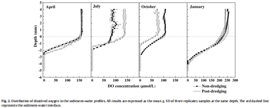 研究意義:OPD是反映沉積物表層氧化還原狀態(tài)的關(guān)鍵指標(biāo)。研究發(fā)現(xiàn)疏浚后OPD在4月和1月有所增加(分別增加0.4 mm和0.6 mm),說(shuō)明疏浚改善了沉積物表層的氧化環(huán)境,這有利于鐵氧化物形成,從而吸附固定磷。