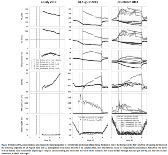 研究意義:明確了潮汐池環(huán)境的極端可變性。數(shù)據(jù)顯示O2在白天顯著過飽和(最高達(dá)210%),夜間則消耗嚴(yán)重,直接證明了池內(nèi)初級(jí)生產(chǎn)(光合作用)和呼吸作用的強(qiáng)烈晝夜交替,且池水體積小放大了這種效應(yīng)。