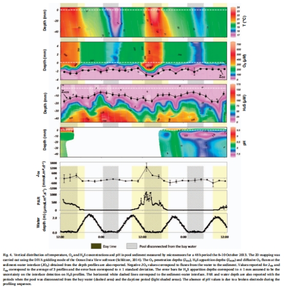 數(shù)據(jù):使用Unisense微型傳感器獲得的O2、H2S、pH和溫度的垂直分布及時(shí)序變化。