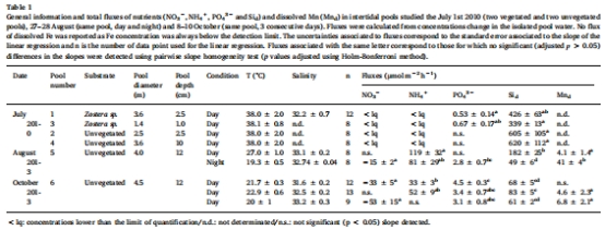 海灣尺度的重要性:粗略估算表明,潮汐池對(duì)阿卡雄灣的營養(yǎng)鹽(如PO43-、NH4+)輸入有顯著貢獻(xiàn),在進(jìn)行海灣營養(yǎng)鹽收支計(jì)算時(shí)不容忽視。