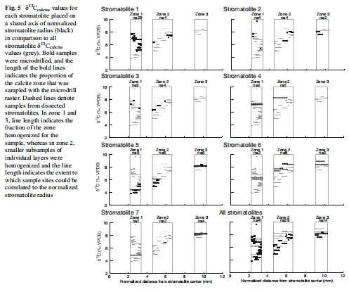 數據:疊層石從內到外不同生長帶的δ13Ccalcite和δ1?Ocalcite值。