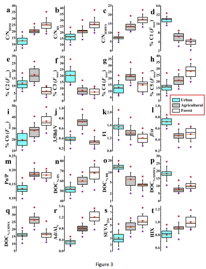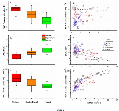 與森林/自然溪流相比,農業和城市景觀會(i)增加DOM的輸出量(更高的產量)和含氮量(更低的C/N比),這是由于水文路徑縮短所致;