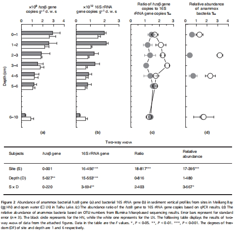 數據:hzsB基因拷貝數(anammox細菌)、16S rRNA基因拷貝數(總細菌)、hzsB/16S rRNA比值(anammox細菌相對豐度)。