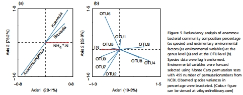 數據:RDA排序圖顯示anammox細菌群落結構與環境因子的關系。