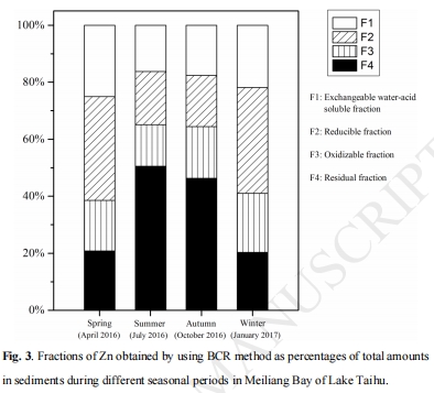 研究意義:揭示了Zn在沉積物中的賦存形態和潛在活性。數據顯示可還原態(與Fe/Mn氧化物結合)是Zn的重要儲庫,其比例變化(如夏季降低、冬季升高)為解釋溶解態Zn的季節性釋放和固定提供了關鍵依據。