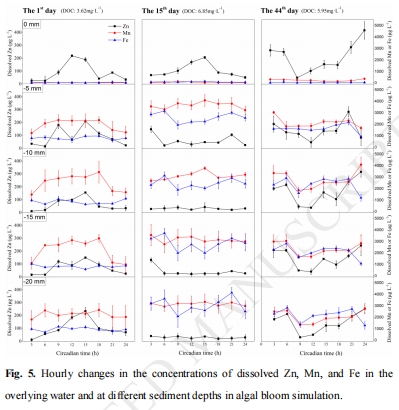 藻華模擬實驗:向沉積物-水系統中添加含銅綠微囊藻的湖水,模擬藻華生長、爆發和降解過程,監測不同時期(第1、15、44天)沉積物孔隙水中Zn、Mn、Fe的濃度晝夜變化(圖5, 圖6),并使用DGT測量有效態Zn(圖7)。