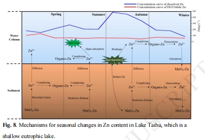 鋅形態發生季節性轉化:藻華降解期,大量的Zn從固相釋放后,主要與DOM形成有機絡合物(DGT有效態Zn比例低而溶解態Zn濃度高),改變了其生物有效性和環境行為。