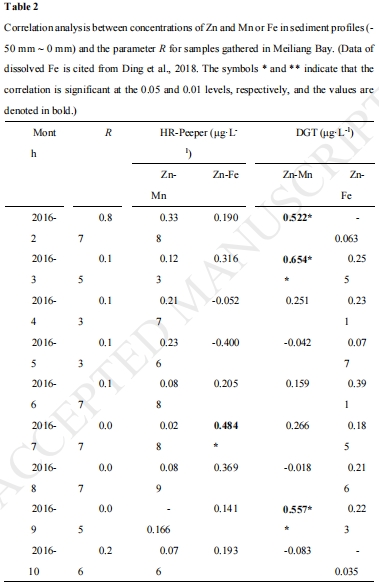 數據:月度水溫、DO、pH、Eh、DOC、葉綠素a等環境參數;Zn與Mn、Fe濃度的相關性分析。
