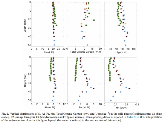 數(shù)據(jù):Si、Al、Fe、Mn、總有機(jī)碳(TOC)和U在沉積物垂直剖面中的濃度變化。