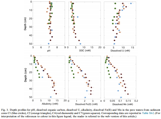 數(shù)據(jù):pH、溶解有機(jī)碳(DOC)、溶解U、堿度、Fe(II)和Mn在孔隙水中的垂直分布。