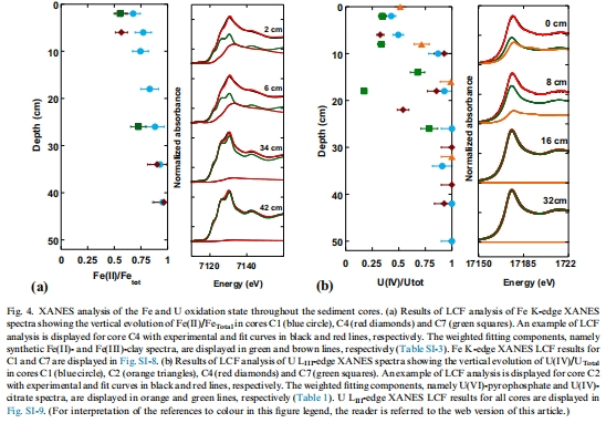研究意義:提供了鈾和鐵氧化還原狀態(tài)的直接證據(jù)。數(shù)據(jù)顯示U(IV)比例從表層~40%增至深層~100%,與Fe(II)比例升高同步,證實(shí)了U(VI)還原與Fe(III)還原耦合。這是證明Fe驅(qū)動(dòng)U還原的關(guān)鍵證據(jù)。