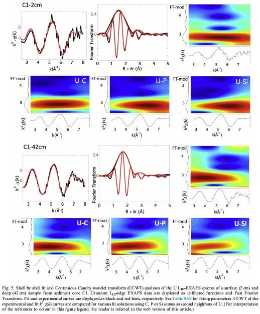 研究意義:揭示了鈾的原子級形態(tài)。EXAFS顯示U以單核物種形式存在(缺乏U-U配位路徑),與C、P或Si配體結(jié)合,表明鈾并非以晶質(zhì)鈾石形式沉淀,而是以表面結(jié)合或有機(jī)絡(luò)合的非晶態(tài)U(IV)為主。這解釋了化學(xué)提取中高比例可提取鈾的原因。